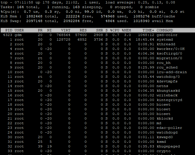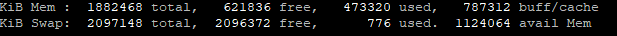 دو خط آخر به ترتیب نشان دهنده ی خلاصه حافظه فیزیکی RAM و Swap است در این دو مورد حافظه کل در حال استفاده، حافظه آزاد، بافر کش نشان داده می شوند. مقادیر با توجه به میزان حافظه فیزیکی نصب شده به صورت mib و kib و GIB مخفف مگا، کیلو و گیگا بایت نشان داده می شود.