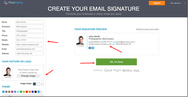 قدم سوم: با سفارشی کردن امضای ایمیلتان،شروع کنید. نام و نام خانوادگی، شرکت، وب سایت و دیگر فیلدهای ضروری را پر کنید. سپس یک عکس حرفه ای از امضای خود آپلود نمایید. شما می توانید هر زمانی که خواستید، تغییرات ایجاد کنید. پس نگران اشتباه وارد کردن اطلاعات خود نباشید. هنگامی که کامل شد “OK, Im Done” را کلیک کنید.