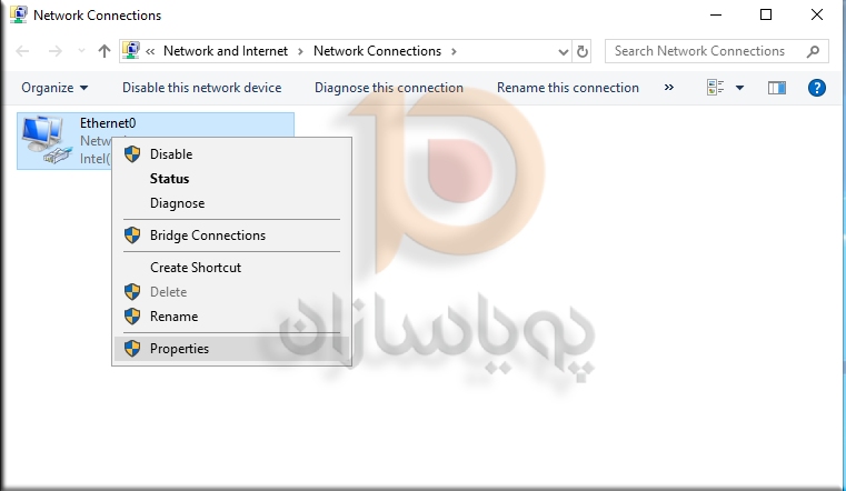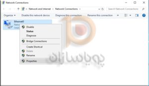 3. بر روی Local Area Connection راست کلیک نمایید و از میان گزینه های وارد شده گزینه Properties را انتخاب نمایید.