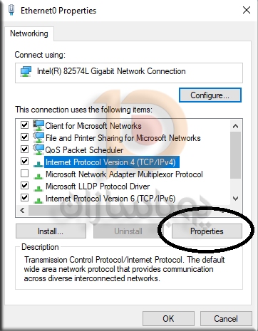 4. اطمینان حاصل نمایید پروتکل اینترنت ورژن 4 را انتخاب و سپس دکمه Properties را کلیک کنید.