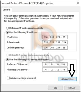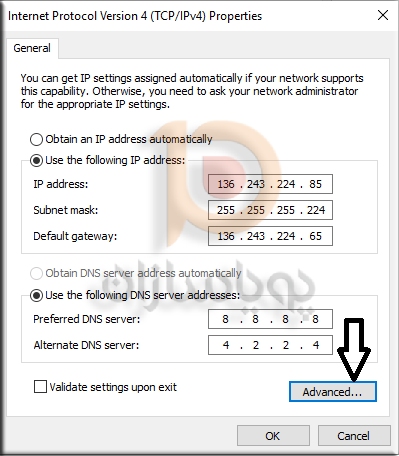 5. در صفحه جدید ای پی اصلی سرور را به همراه تنظیمات شبکه مشاهده می کنید و اضافه شدن ای پی اضافه بر روی دکمه Advanced کلیک کنید تا صفحه جدید مشاهده شود.