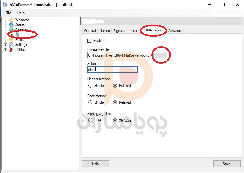 در ادمین Hmailserver به DOMAINS – ‘دامنه مورد نظر’ – “DKIM Signing” رفته
