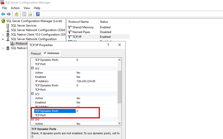اگر تنظیمات Listen All در تب Protocol روی “YES” تنظیم شده باشد، فقط از مقادیر TCP Port و TCP Dynamic Port در قسمت IPAll استفاده میشود و بخشهای جداگانه IPn به طور کامل نادیده گرفته میشوند. اگر تنظیمات Listen All روی “NO” تنظیم شود، تنظیمات پورت TCP و پورت دینامیک TCP در قسمت IPAll نادیده گرفته می شود و به جای آن از تنظیمات پورت TCP، پورت دینامیک TCP و تنظیمات فعال در بخش های جداگانه IPn استفاده می شود. هر بخش IPn دارای یک تنظیمات Enabled با مقدار پیشفرض “No” است که باعث میشود SQL Server این آدرس IP را نادیده بگیرد، حتی اگر یک پورت تعریف شده باشد.