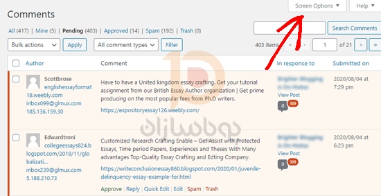 اگر فقط چند صد نظر در انتظار دارید ، حذف سریع آنها به صورت گروه بسیار ساده است. کافی است به صفحه ” Comments” در قسمت مدیریت وردپرس بروید و سپس روی برگه ” Pending” کلیک کنید تا لیستی از تمام نظرات در انتظار خود را ببینید. به طور پیش فرض ، این لیست همزمان 20 اظهارنظر در انتظار را نشان می دهد. برای تغییر این مورد ، روی زبانه “Screen Options” در گوشه بالا سمت راست صفحه کلیک کنید.