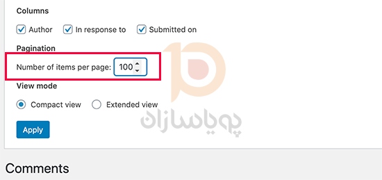 سپس مقدار 100 را برای فیلد Number of items per page در نظر بگیرید و برروی Apply کلیک کنید.