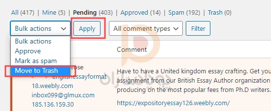 بروید و روی دکمه Apply کلیک کنید تا همه نظرات به سطل زباله منتقل شود.