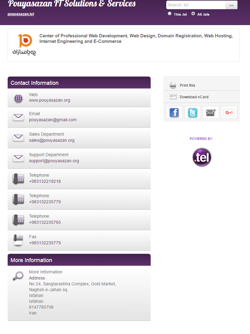 شما می توانید صفحه نمایش دامنه .tel و امکانت آن را بر روی دامنه pouyasazan.tel در عکس زیر مشاهده نمایید .