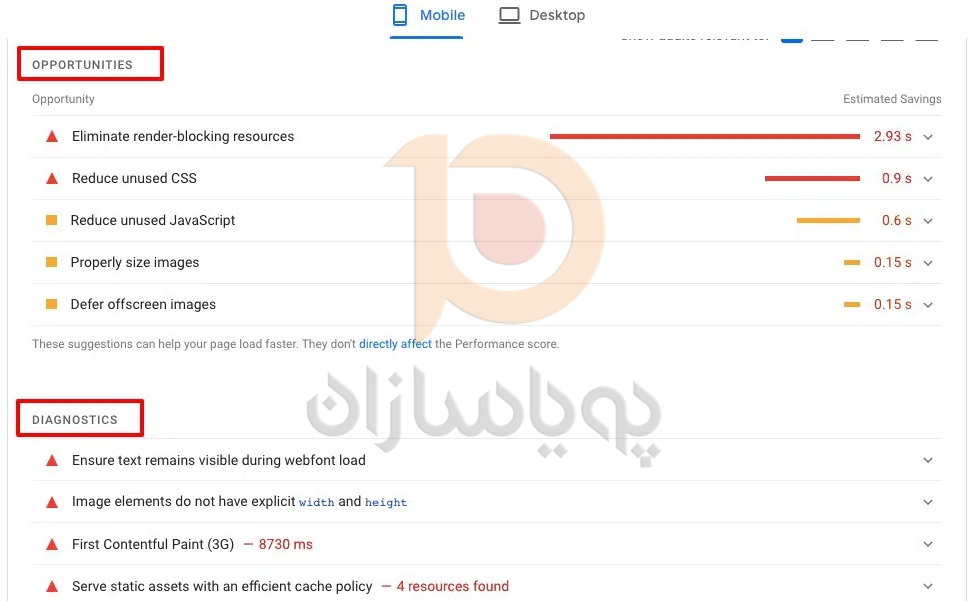 از قسمت Diagnose Performance Problems، می توانید تجزیه و تحلیل و توصیه های دقیق از بارگذاری سایت خود در یک محیط شبیه سازی شده را مشاهده کنید. از بخش فرصتها میتوانید توصیهای را برای بهبود سرعت و عملکرد وبسایت خود مشاهده کنید. این پیشنهاد به شما کمک می کند تا وب سایت خود را سریع تر و روان تر بارگذاری کنید.