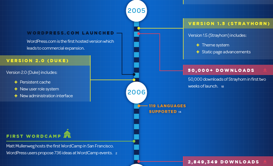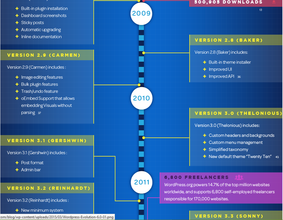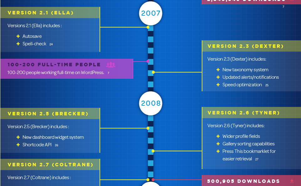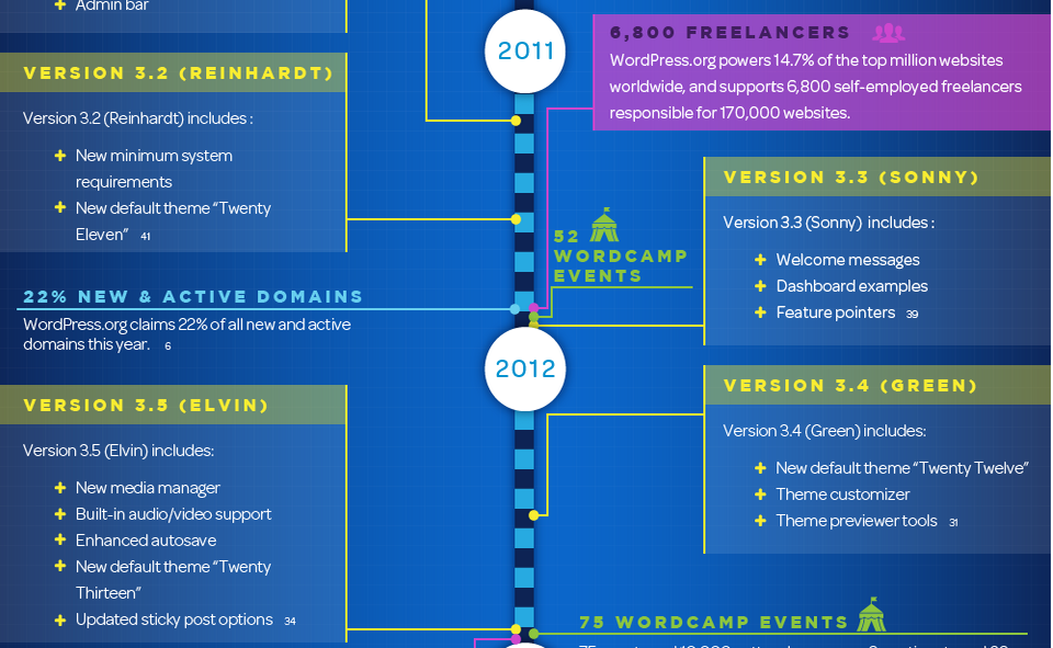 ما این جدول زمانی را به نمایش گذاشته ایم تا سیر به روزرسانی و نسخه های جدید وردپرس در طول 12 سال را نمایش دهیم.