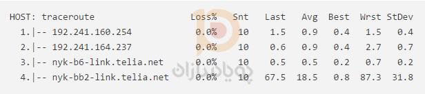 همچنین امکان اجرای MTR با گزینه –report وجود دارد. 10 بسته برای هر هاپ ارسال می شود و نتایج تولید می شود
