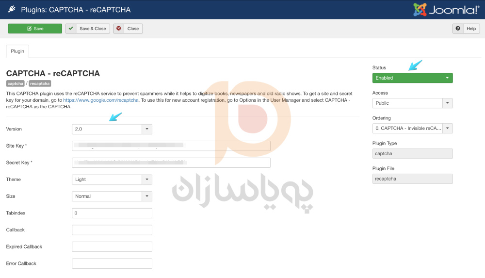 4- برای افزونه CAPTCHA – reCAPTCHA ، نسخه 2.0 را انتخاب کرده و Site Key & Secret Key را وارد کنید ، سپس وضعیت پلاگین را به صورت “Enabled” تنظیم کنید.
