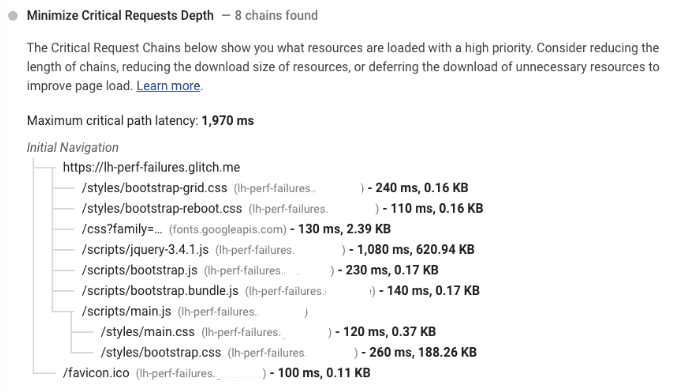 اگر Google تشخیص دهد (Critical request chains)CRC شما از نظر طول یا اندازه بیش از حد بزرگ است و یا تأخیر قابل توجهی دارد ، این زنجیره ها را به شما نشان می دهد.