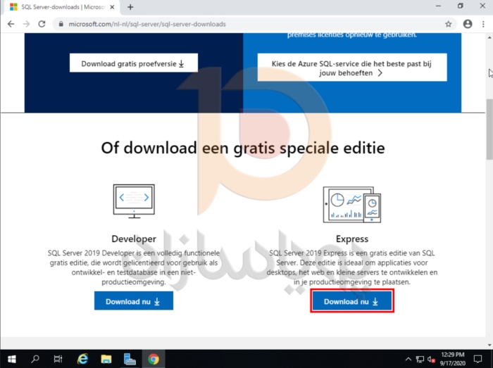 به ادرس https://www.microsoft.com/nl-nl/sql-server/sql-server-downloads بروید. سمت پایین ، نسخه Express را انتخاب کنید . برای شروع دانلود روی Download nu کلیک کنید.