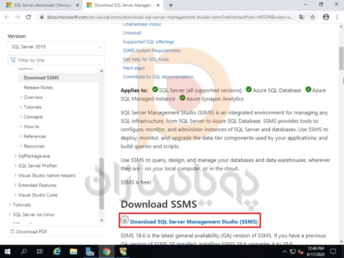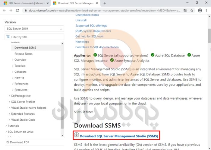 یک وب سایت جدید باز خواهد شد. برای دانلود SSMS به پایین بروید. سپس بر روی Download SQL Server Management Studio (SSMS) کلیک کنید.