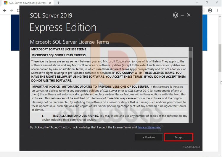 می توانید شرایط مجوز Microsoft SQL Server را بخوانید. سپس روی Accept کلیک کنید.