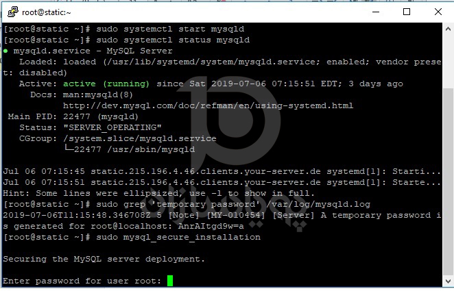 هنگامی که mysql برای اولین بار استارت می شود، یک کلمه ی عبور موقت برای کاربر روت my sql ایجاد می شود که با دستور زیر می توانید آن را مشاهده نمایید.