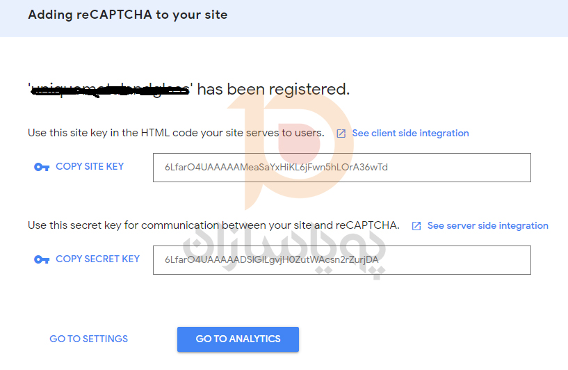 در این صفحه lable و ورژن recaptcha و نام سایت وارد می شود و پس از ادامه کدهای مورد نیاز دریافت می شوند مطابق با تصویر زیر: