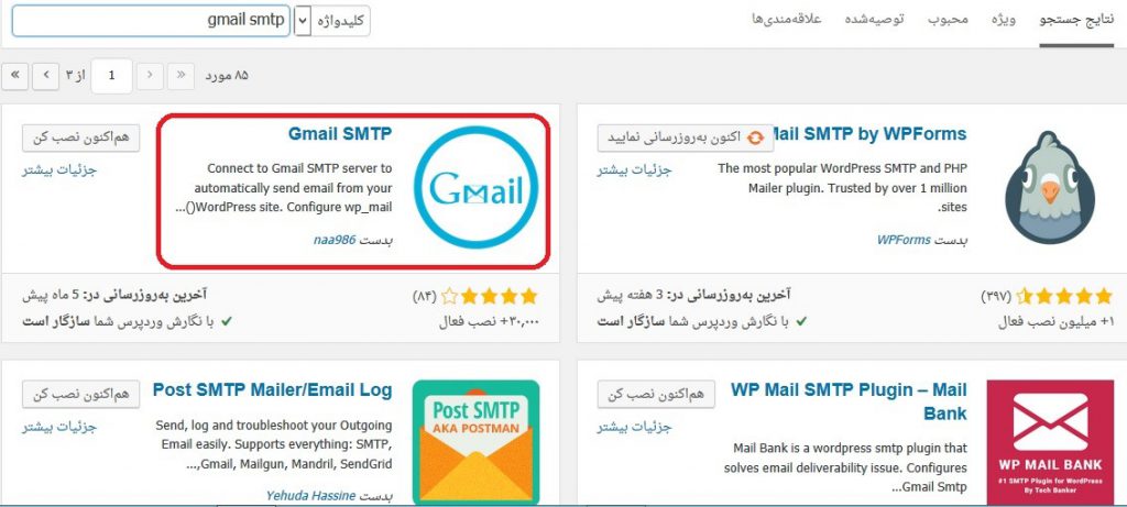 پس از اطمینان از آماده بودن این موارد افزونه Gmail SMTP را برای وردپرس خود نصب کنید. وارد داشبورد خود شوید و به صفحه افزونه ها بروید. بر روی دکمه “افزودن جدید” کلیک کنید. در کادر جستجو ، Gmail SMTP را وارد کنید. افزونه جست و جو شده را نصب کنید (در تصویر زیر نشان داده شده است).