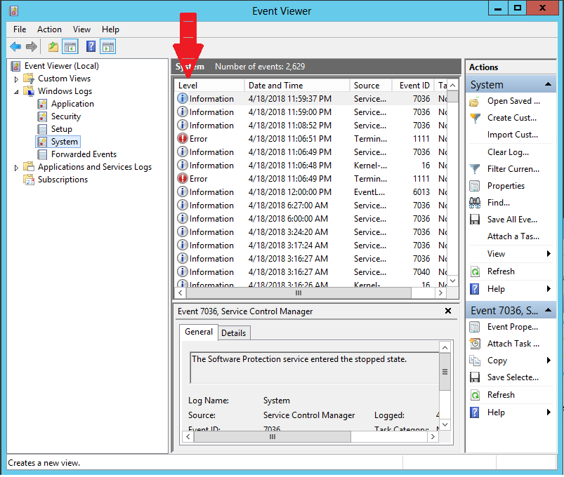 - نوع لاگ هایی که تمایل به دیدن آن را دارید انتخاب نمایید(برای مثال: Application، System)