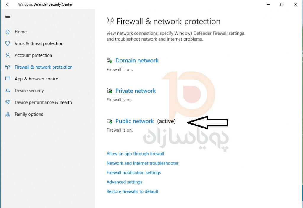 بر روی Public Network کلیک نمایید و گزینه ی Windows Defender Firewall را غیر فعال نمایید.