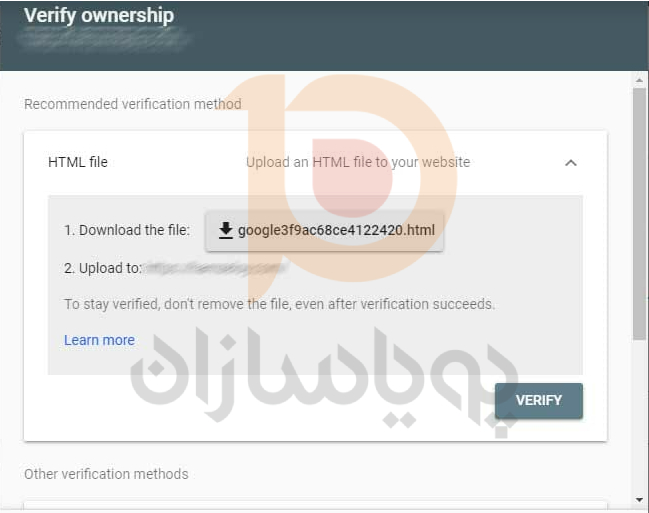 برای این آموزش از URL Prefix استفاده شده است و بعد از وارد کردن ادرس سایت فایل html را دانلود و در هاست قرار داده شد و سپس دکمه ی verify کلیک شد.