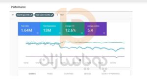 در این بخش می توان تعداد کلیکهای دریافتی، تعداد ایمپرسشنها، میانگین نرخ کلیک (CTR) و میانگین رتبه سایت در موتور جستجوی گوگل را به صورت روزانه دید و حتی تمام این اطلاعات برای هر کلمه کلیدی و هر صفحه وبسایت نیز موجود است.