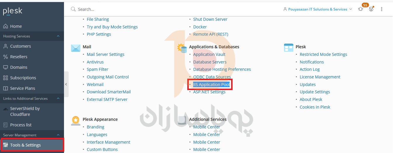 1- پس از لاگین به کنترل پنل پلسک خود به مسیر Tools & Settings > IIS Application Pool بروید