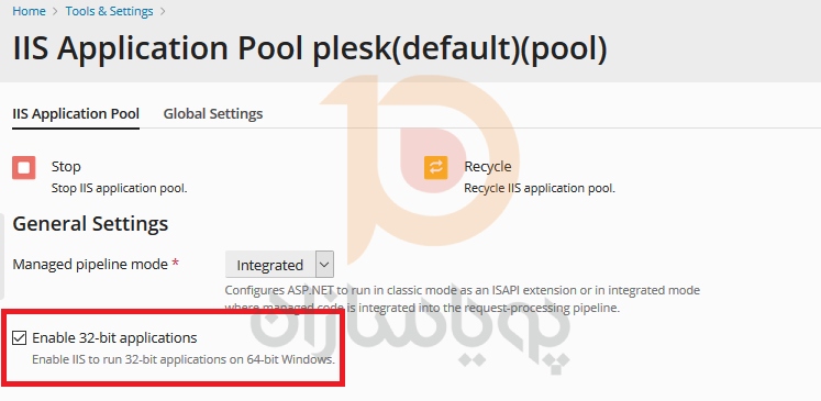 برای فعال کردن حالت 32 بیتی کافی وارد بخش تنظیمات iis application pool شوید و تیک مربوط به گزینه Enable 32-bit applications