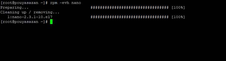 البته نیازی به سوئیچ vh نیست و می توانید فقط با rpm -e nano هم حذف را انجام دهید. فقط در این صورت هیچ خروجی نمایش نمی دهد.