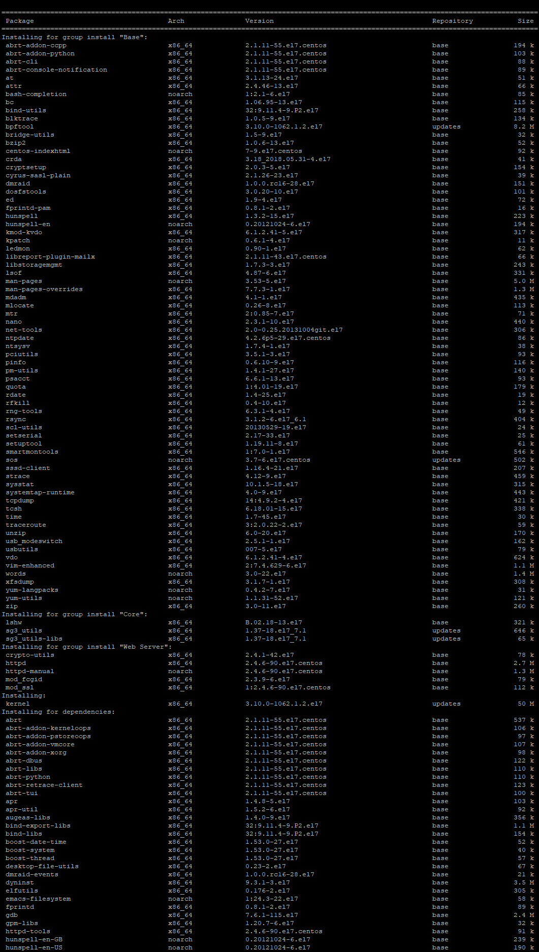دستور groupinstall مقدار زیادی از زمان شما را صرفه جویی خواهد کرد و تمام کارهایی که باید انجام دهید برایتان با همین دستور ساده انجام می دهد. تصور کنید این کار قرار باشد با rpm انجام شود. شما باید 79 پکیج نصب کنید که دارای 108 وابستگی است.